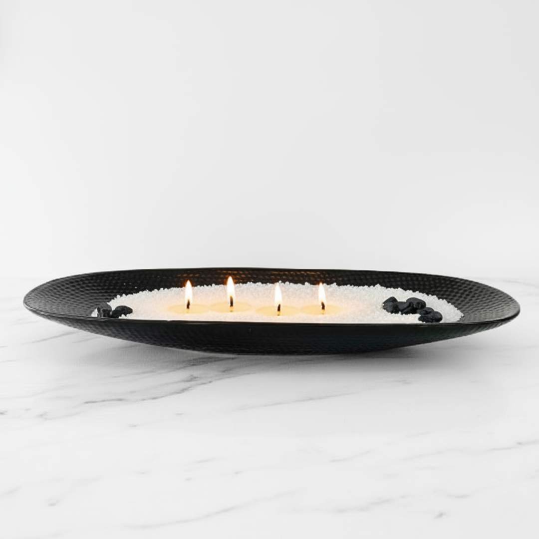 מגש אובלי ארוך בעיצוב כוורת בצבע שחור, רב-תכליתי לסידורי נרות, עיצוב הבית או הגשה מסוגננת.