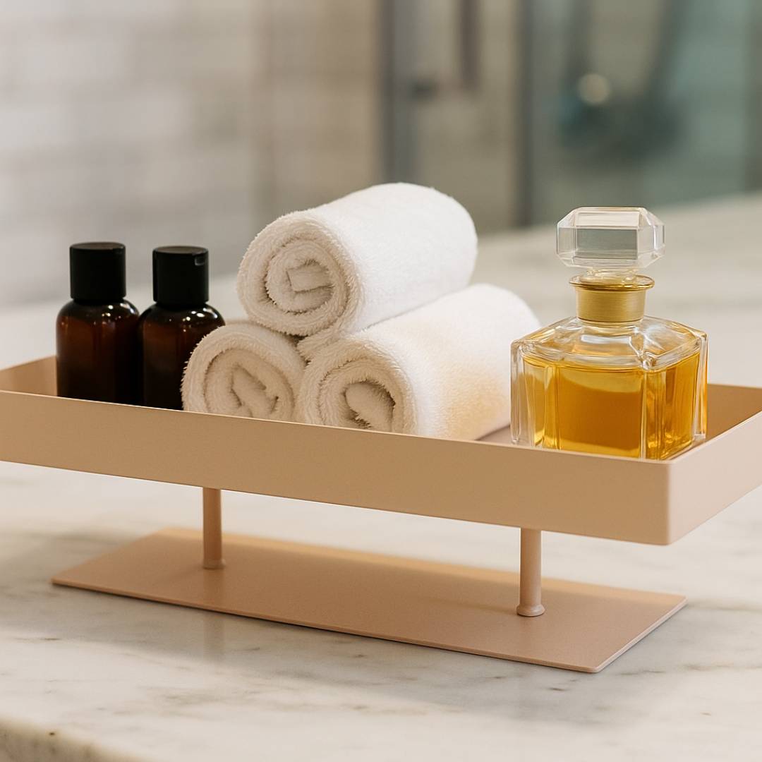 מגש בצבע בז' מודרני המעניק נגיעה של אלגנטיות לכל חדר. עשוי ממתכת עמידה ונועד להחזיק מעמד לאורך שנים, מגש דקורטיבי זה ירשים כל אורח או אורחת ומשדרג כל שולחן ואירוע.