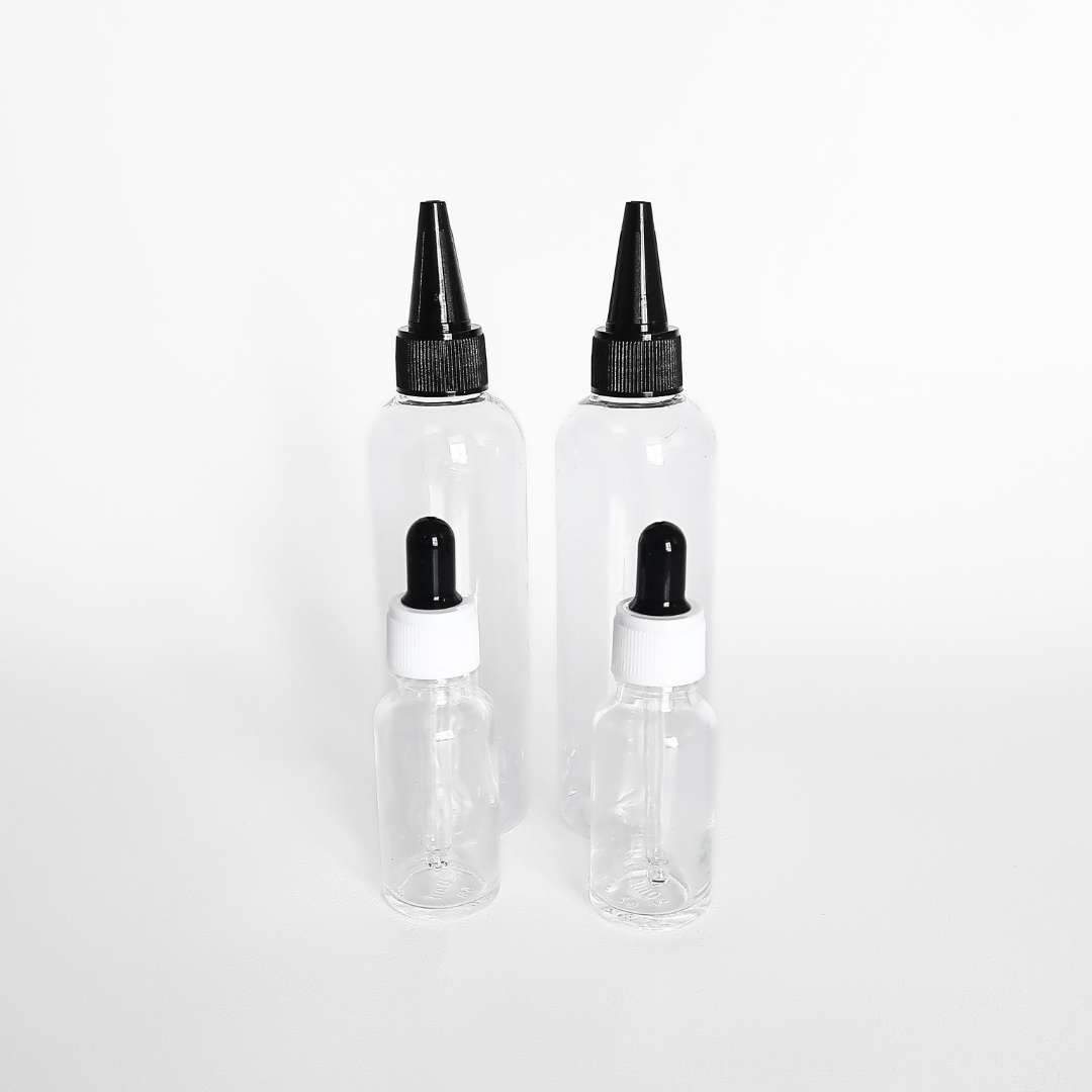 זוג בקבוקי טפטפת איכותיים למילוי נוזלים, סרומים או שמנים אהובים בגודל ידידותי לנסיעות.